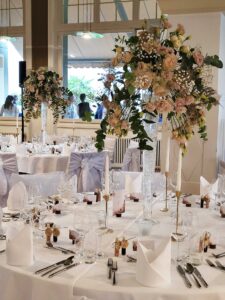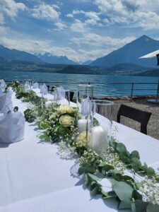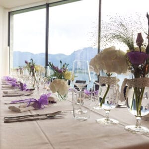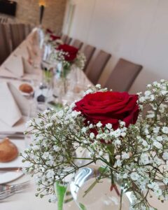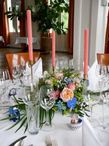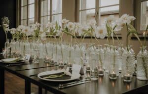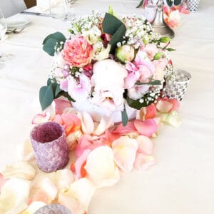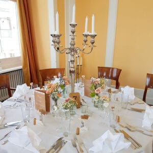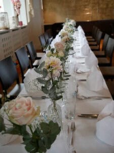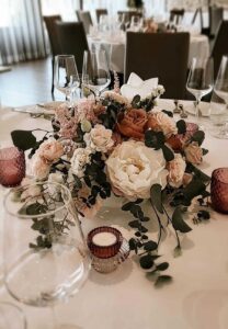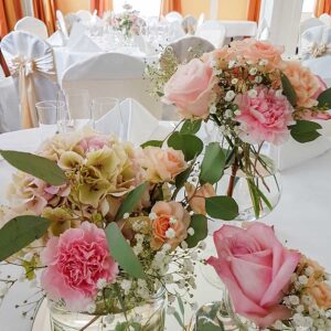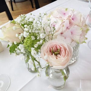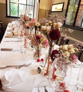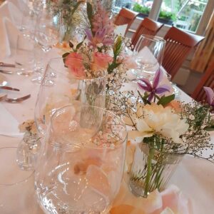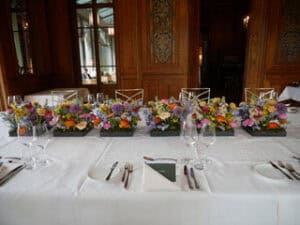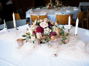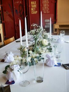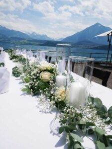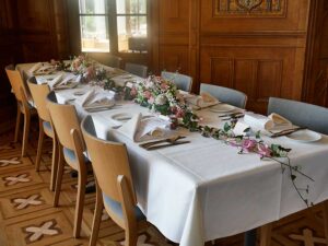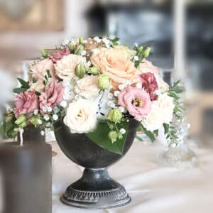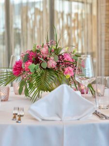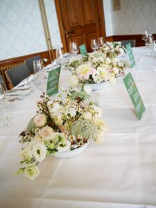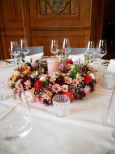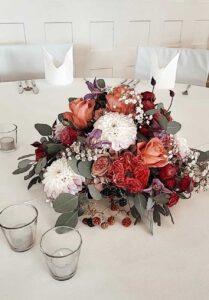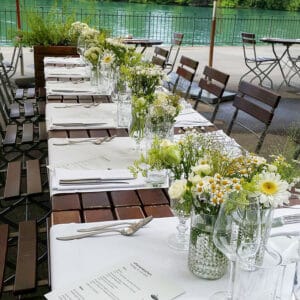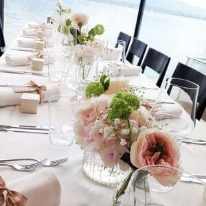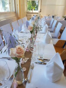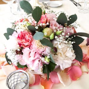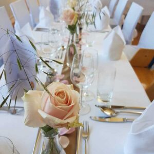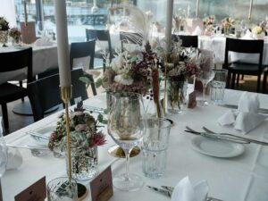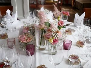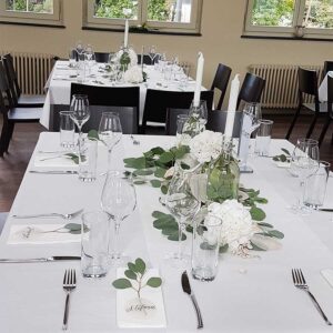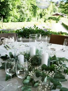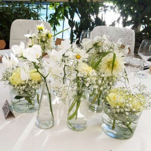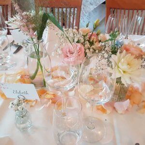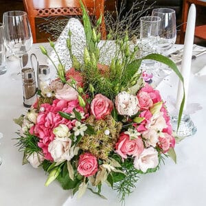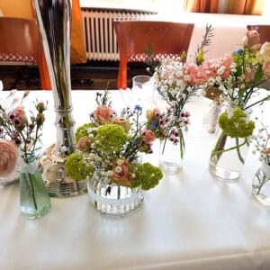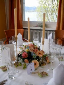 Ob in einzelnen Blüten, als Blumengestecke oder in kunstvoll kreierten Arrangements; ob aus Frischblumen oder Naturmaterialien, kombiniert mit Motto- oder zu dem Brautpaar passenden Lieblingselementen: Tischdekorationen tragen den roten Faden einer Hochzeit hinein in das Festlokal. Nebst Ihren Wünschen orientieren wir uns beim Gestalten einer Tischdekoration an der Atmosphäre des Saals, der Farben von Tischtuch und Servietten sowie an der Jahreszeit. Und noch ein Tipp aus unserem Blumenkästchen: Tischnummern helfen den Gästen, ihren Platz wiederzufinden. Auch in fortgeschrittener Feierlaune.