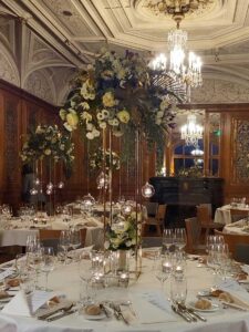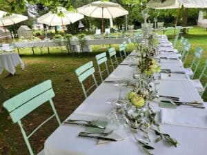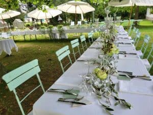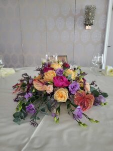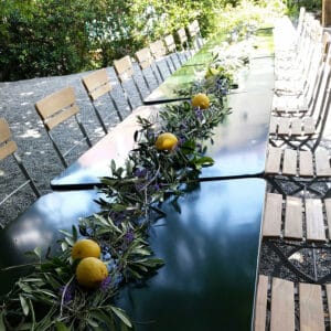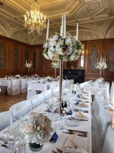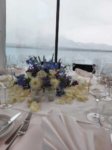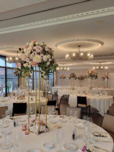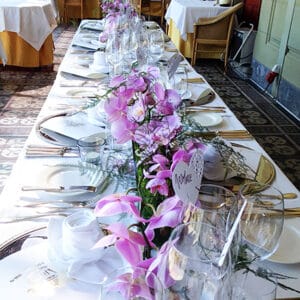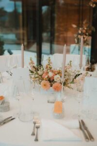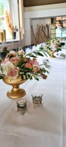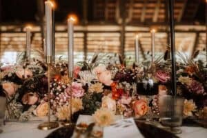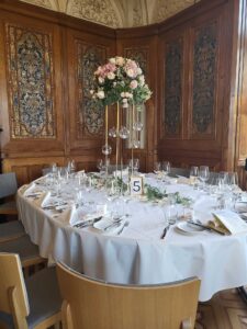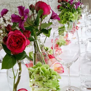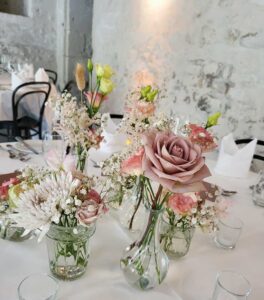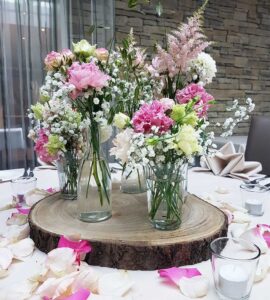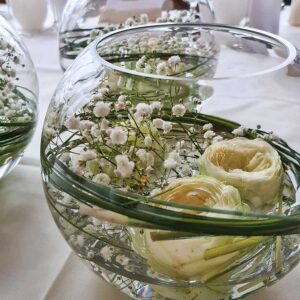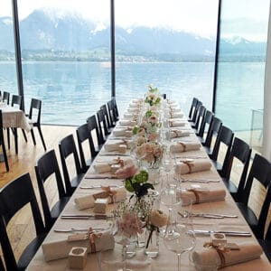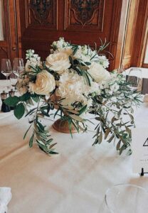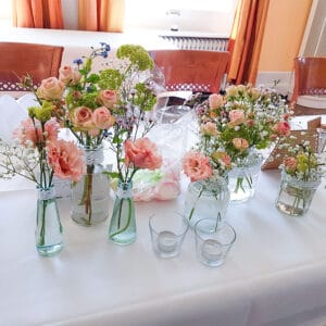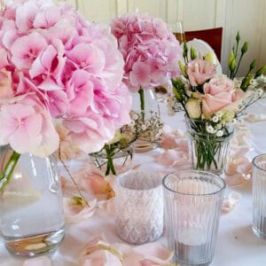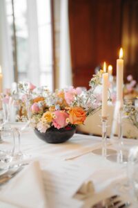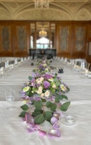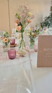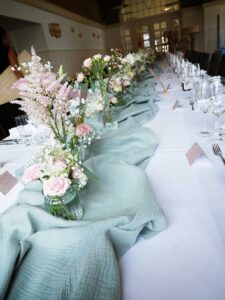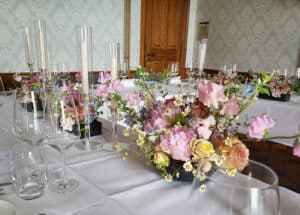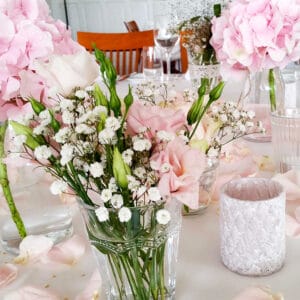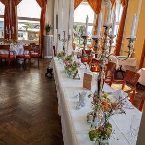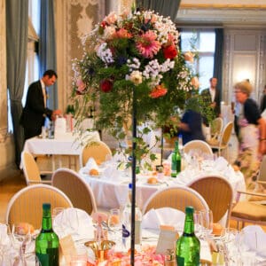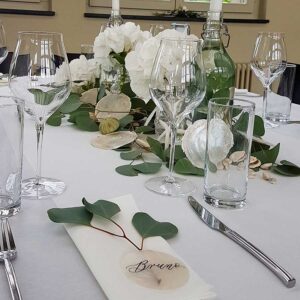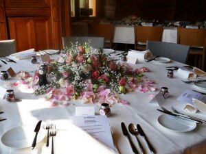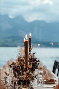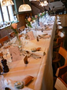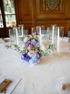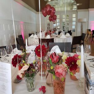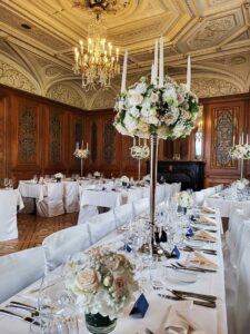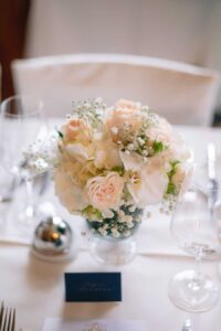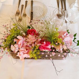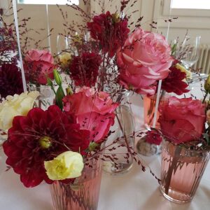 Ob in einzelnen Blüten, als Blumengestecke oder in kunstvoll kreierten Arrangements; ob aus Frischblumen oder Naturmaterialien, kombiniert mit Motto- oder zu dem Brautpaar passenden Lieblingselementen: Tischdekorationen tragen den roten Faden einer Hochzeit hinein in das Festlokal. Nebst Ihren Wünschen orientieren wir uns beim Gestalten einer Tischdekoration an der Atmosphäre des Saals, der Farben von Tischtuch und Servietten sowie an der Jahreszeit. Und noch ein Tipp aus unserem Blumenkästchen: Tischnummern helfen den Gästen, ihren Platz wiederzufinden. Auch in fortgeschrittener Feierlaune.